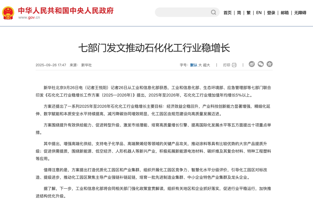 近日,工业和信息化部、生态环境部、应急管理部等七部门联合印发《石化化工行业稳增长工作方案(2025—2026年)》,方案提出2025年至2026年,石化化工行业增加值年均增长5%以上。