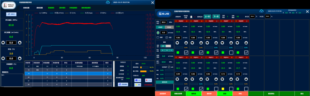 为确保智能压裂试验安全高效推进,公司技术团队提前开展供配液模块联调、一键提排功能验证及泵序模拟测试。在完成全井常规压裂后,选择试验井段,首次通过仪表撬集中控制供配液及加砂等设备。试验过程中,系统依据预设泵注程序自动调控排量,精准执行加砂指令,实现最高砂比7%,累计加砂18.9立方米,总注液570.4立方米,支撑剂加入误差小于0.5%,压裂液粘度全程保持在设计范围内。此次试验初步验证了L3级半自动智能压裂系统的可靠性与现场适应性,首次实现了压裂作业从“人工操作”到“程序驱动”的技术跨越,在显著降低劳动强度的同时,为后续推进智能化压裂升级积累了实践经验。